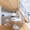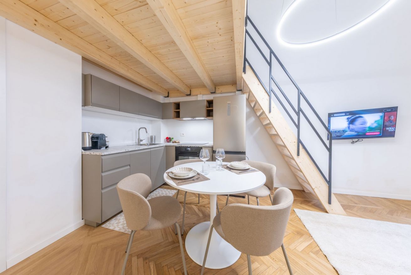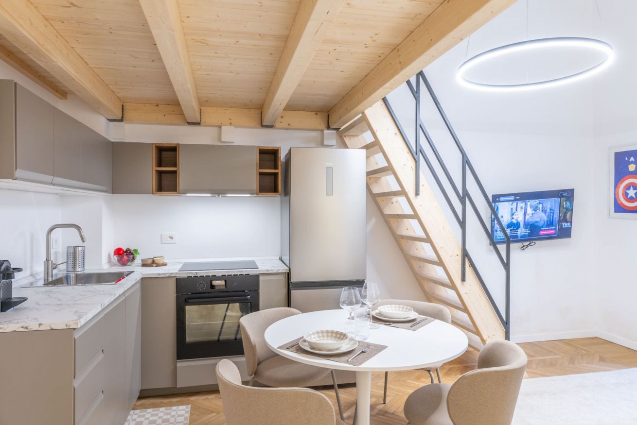 All’ingresso si trova un’accogliente e spaziosa zona living con un comodo divano letto, cucina a vista completamente attrezzata, tavolo da pranzo per 4 persone e smart TV (Netflix, YouTube, ecc).