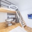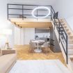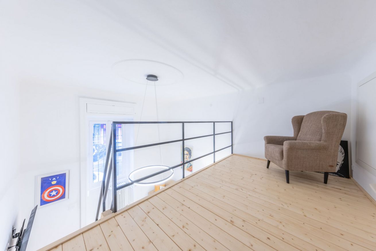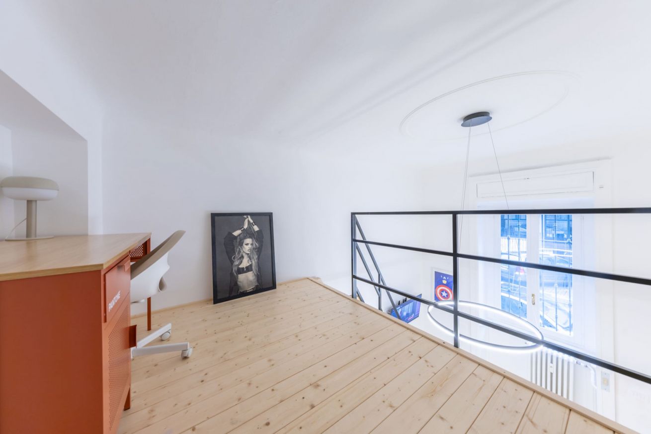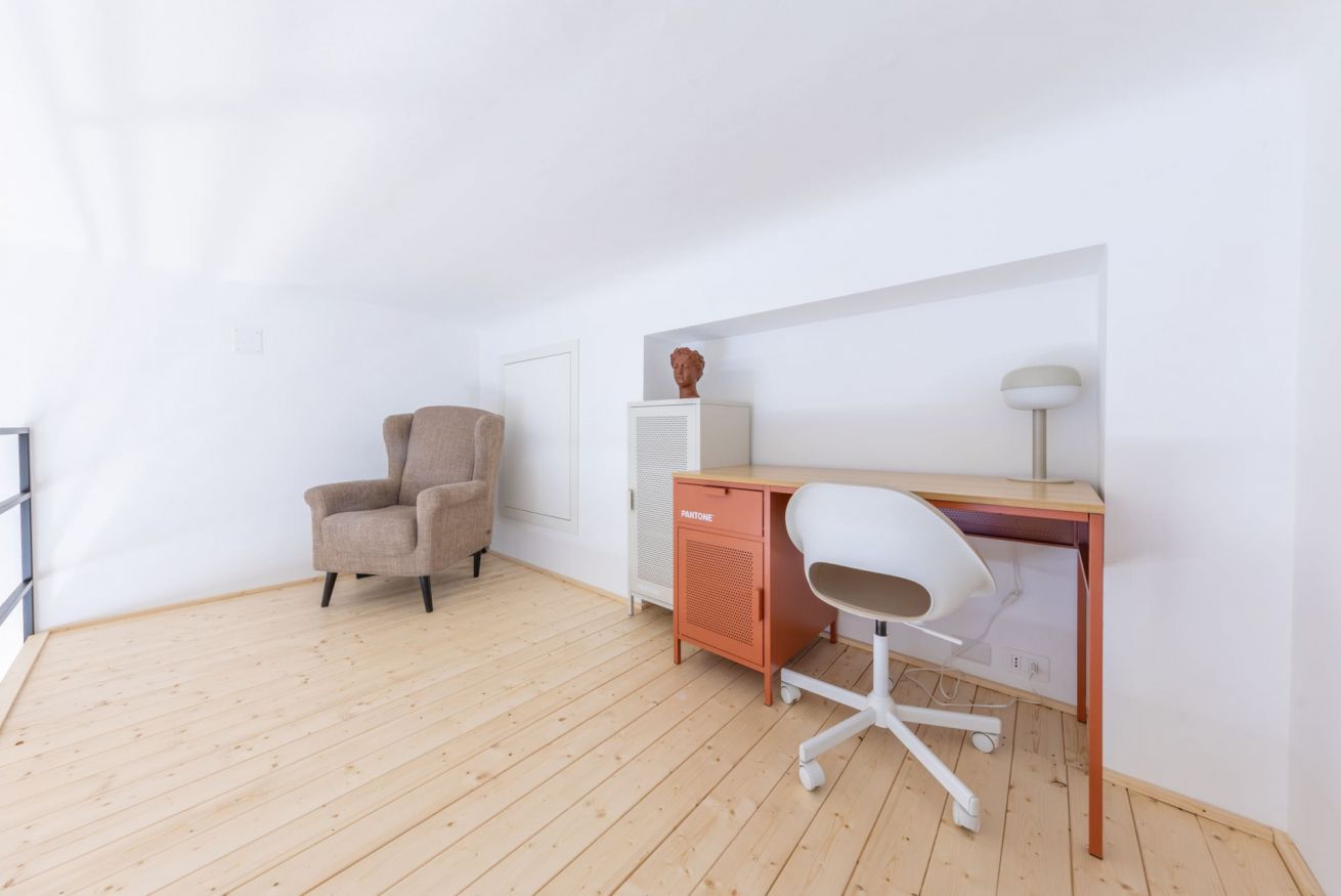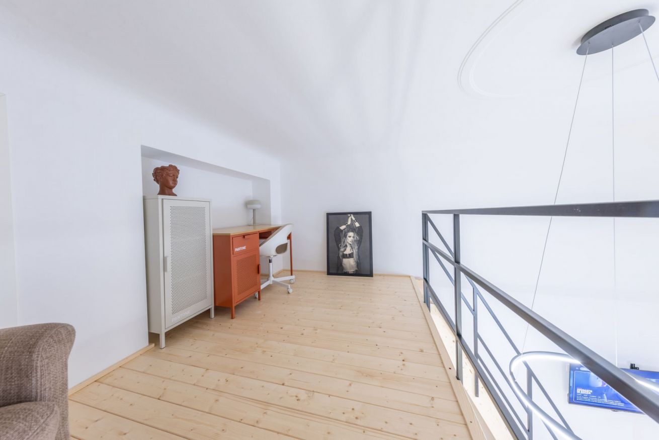 È inoltre presente un soppalco adibito a zona lavoro con scrivania e poltrona.
