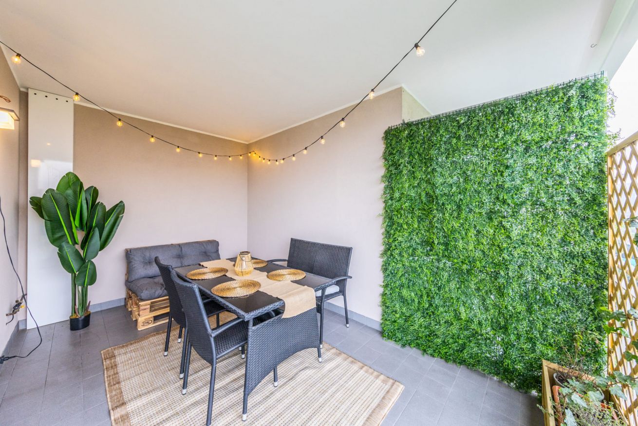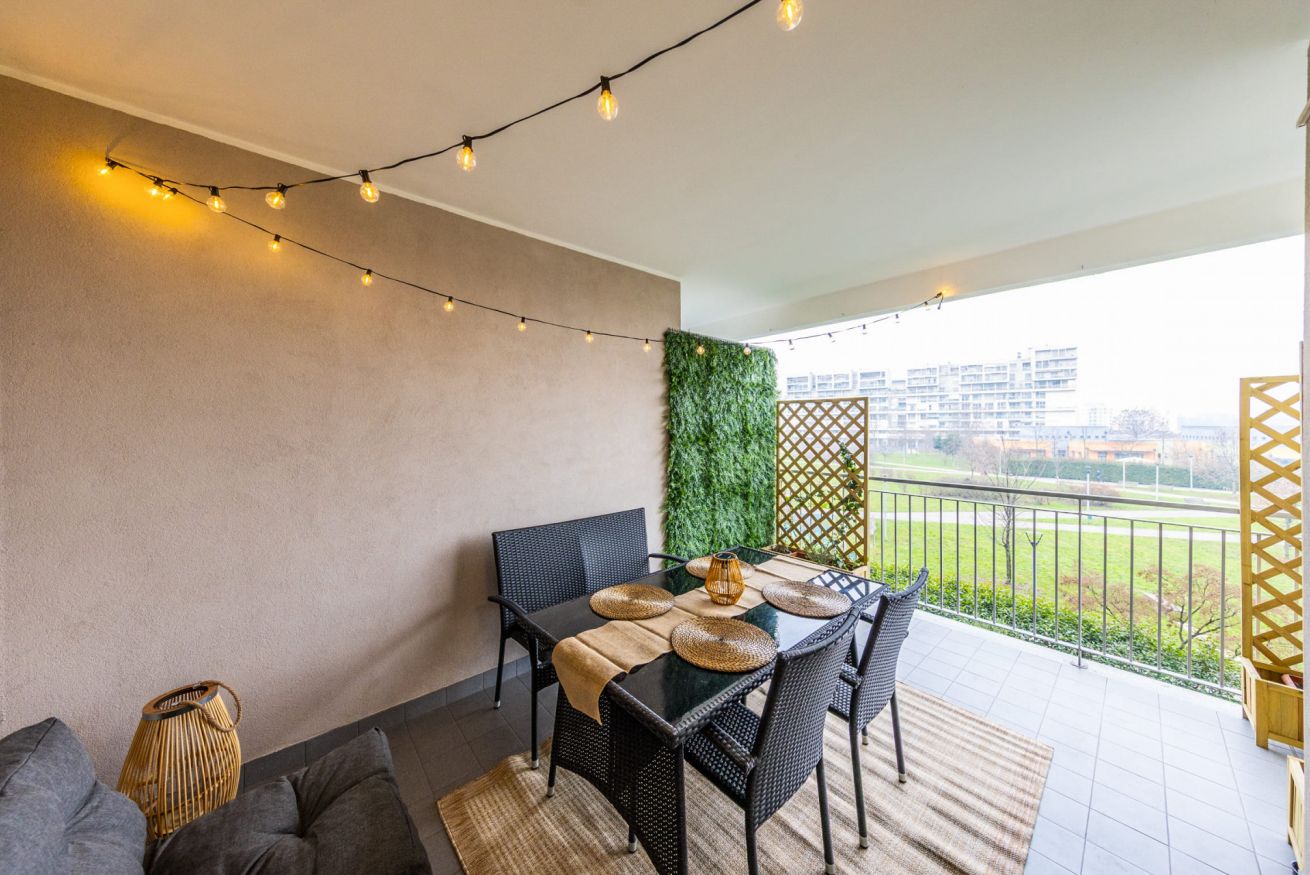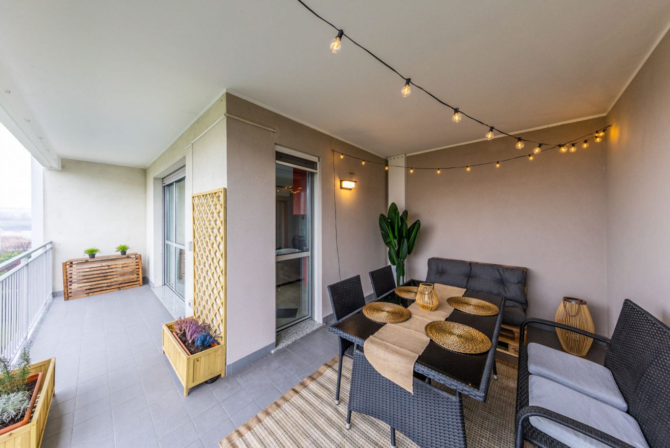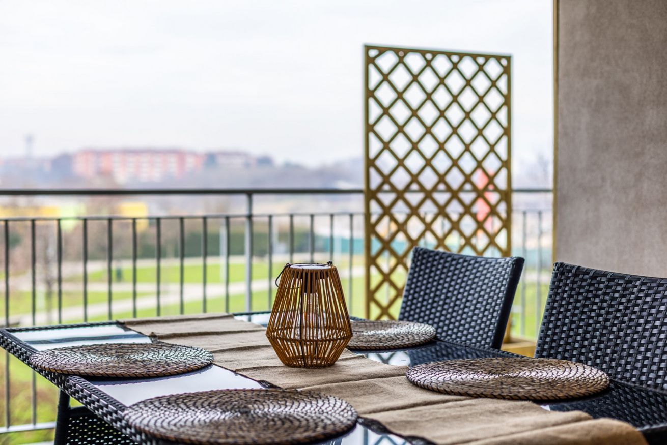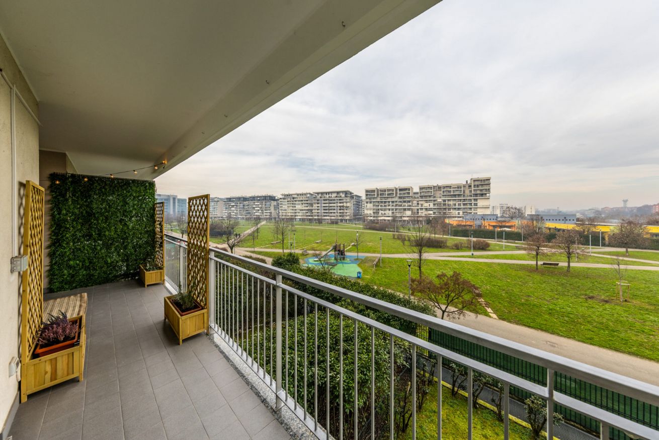 I due ampi balconi privati rappresentano un vero valore aggiunto: con un incantevole e silenzioso affaccio sul verde sono perfetti per godersi un momento di relax all'aperto, sorseggiare un buon caffè, leggere un libro, gustare un pasto o del vino in compagnia, oppure divertirsi con i giochi di società a disposizione.