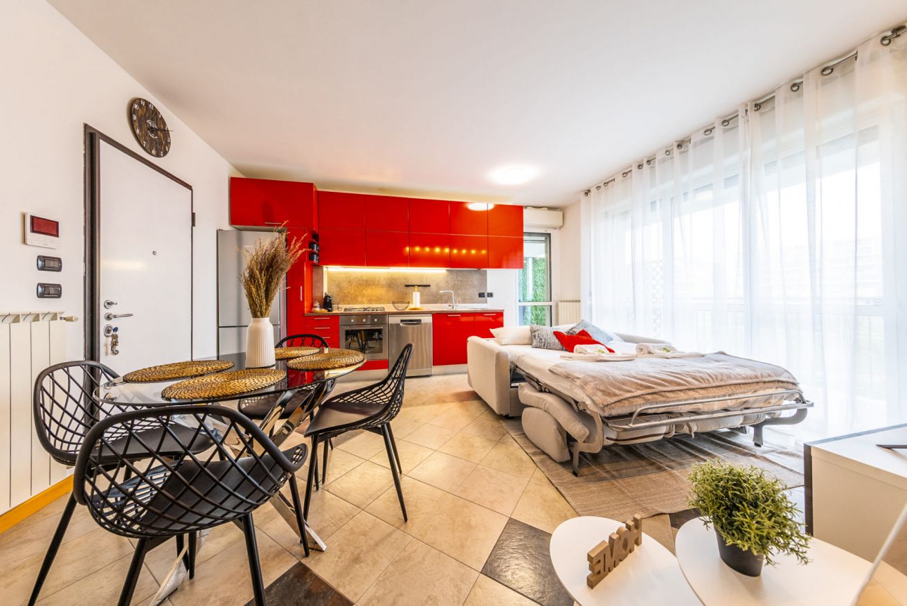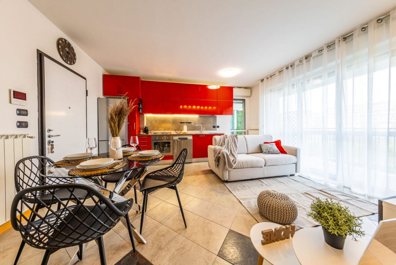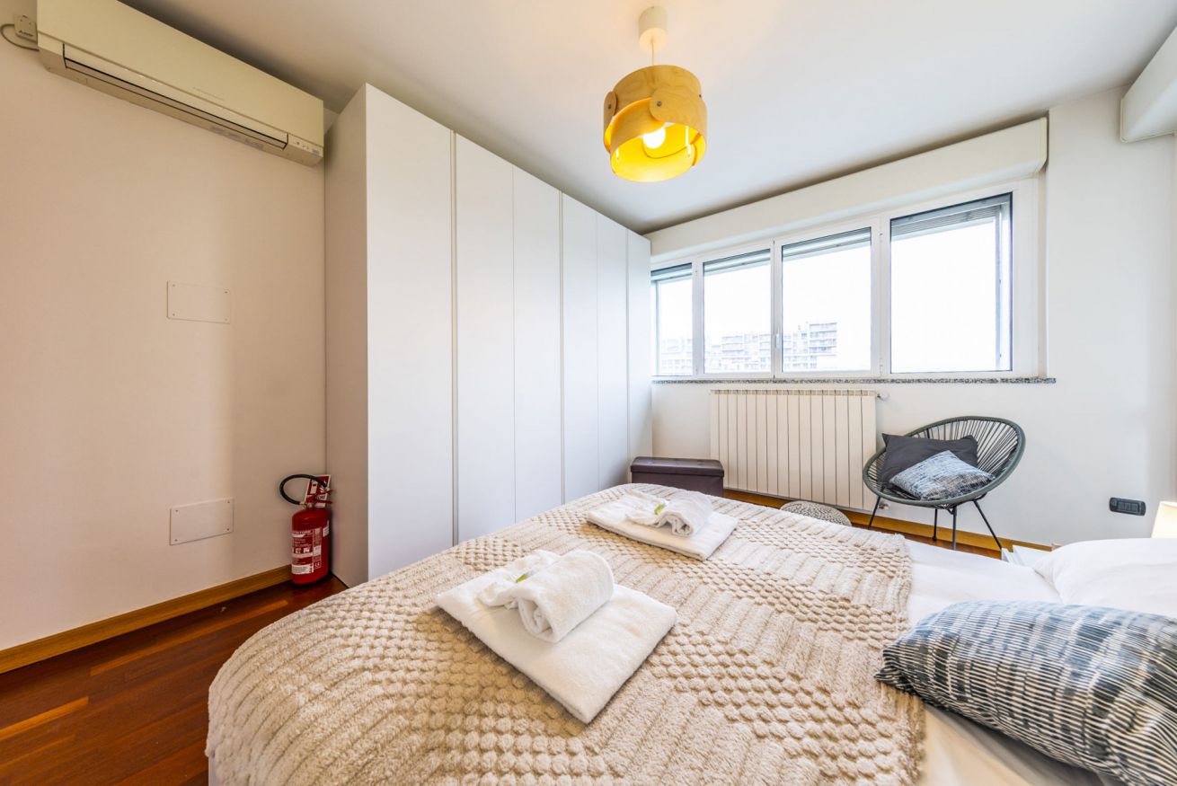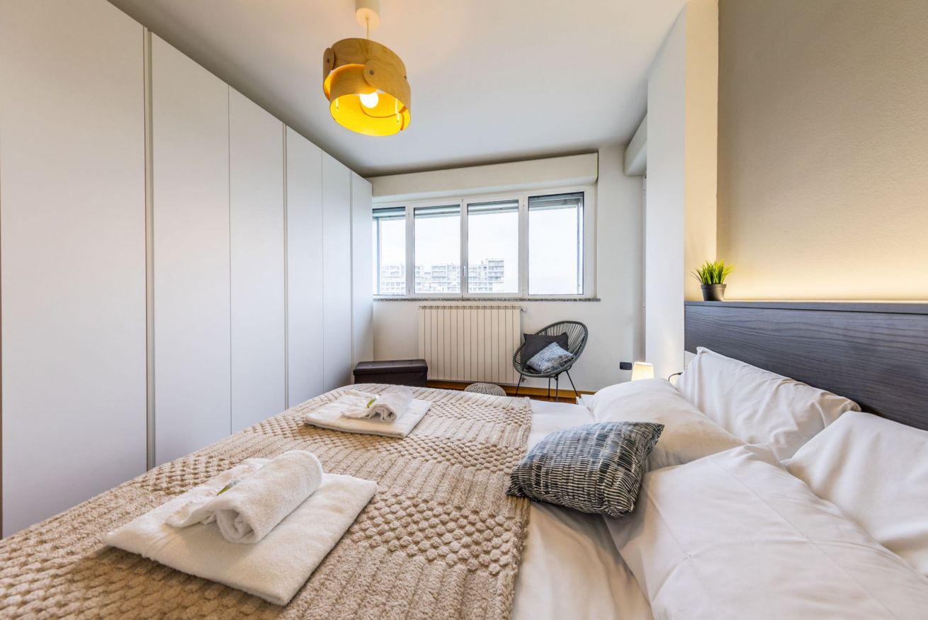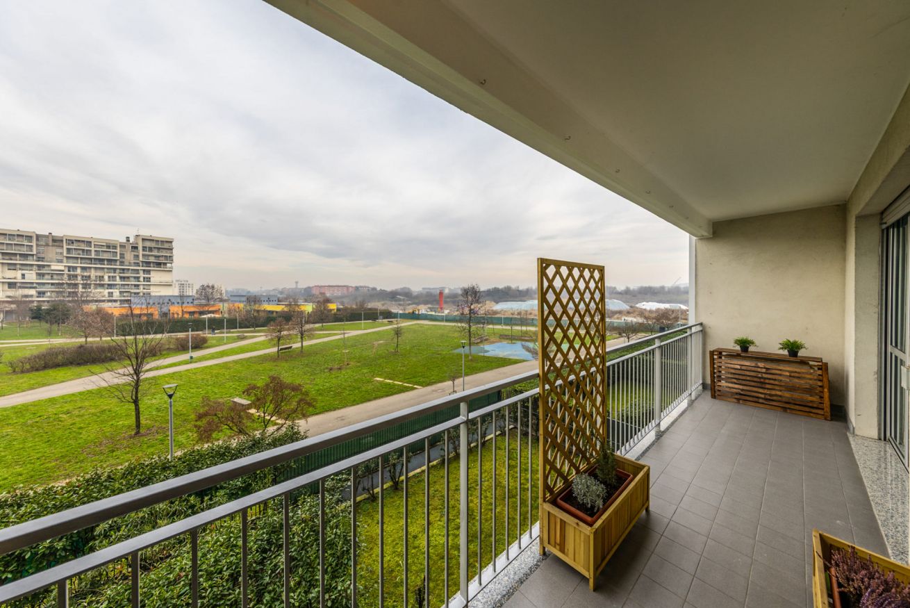 L’appartamento, luminoso e silenzioso, si trova in un moderno complesso residenziale nel quartiere Santa Giulia, una zona tranquilla e ben servita a sud-est di Milano.