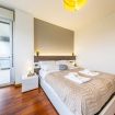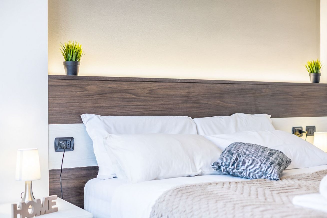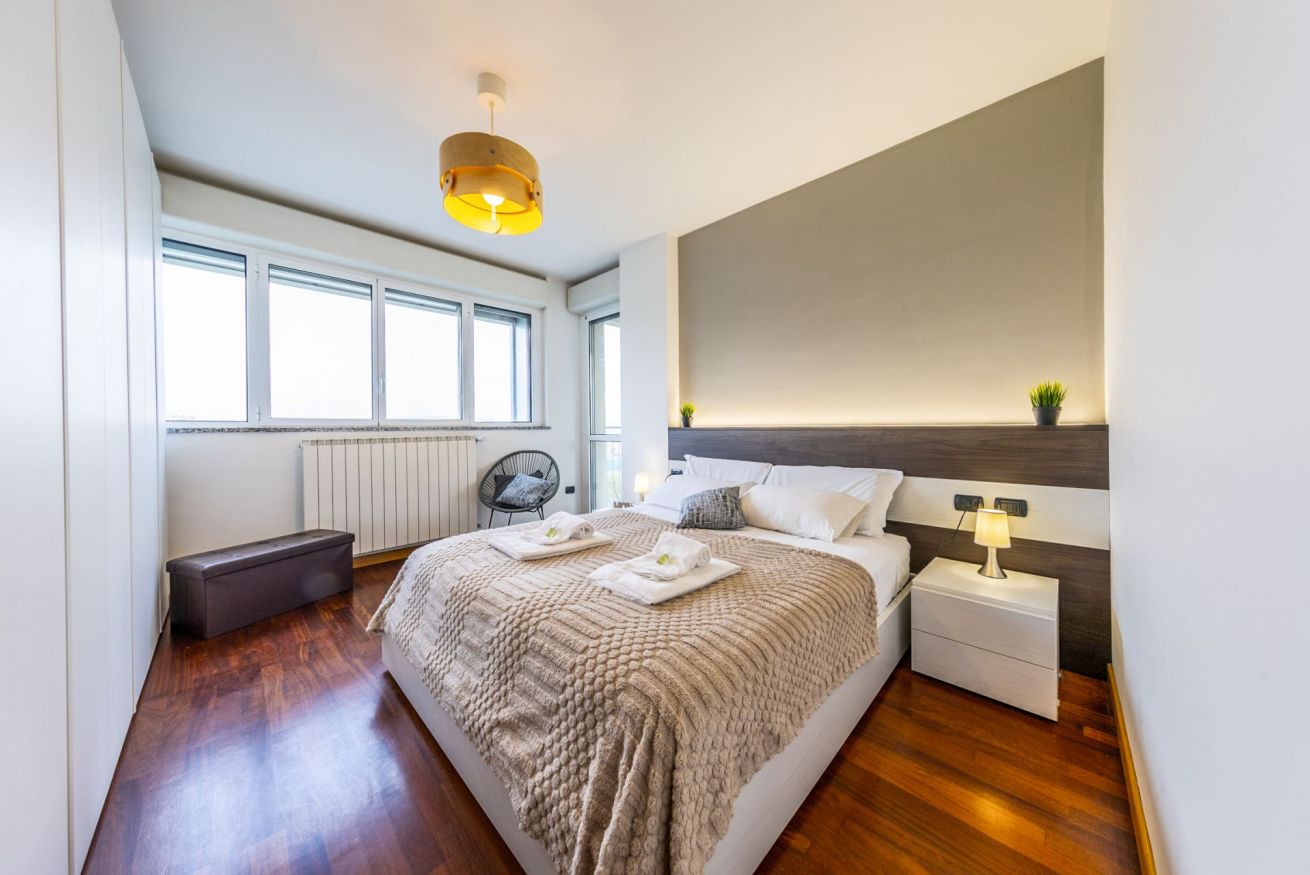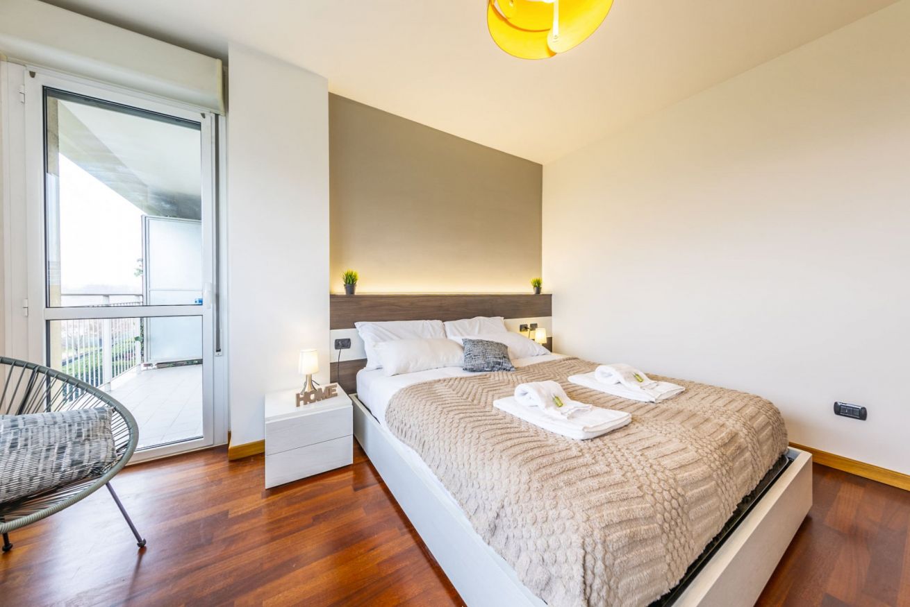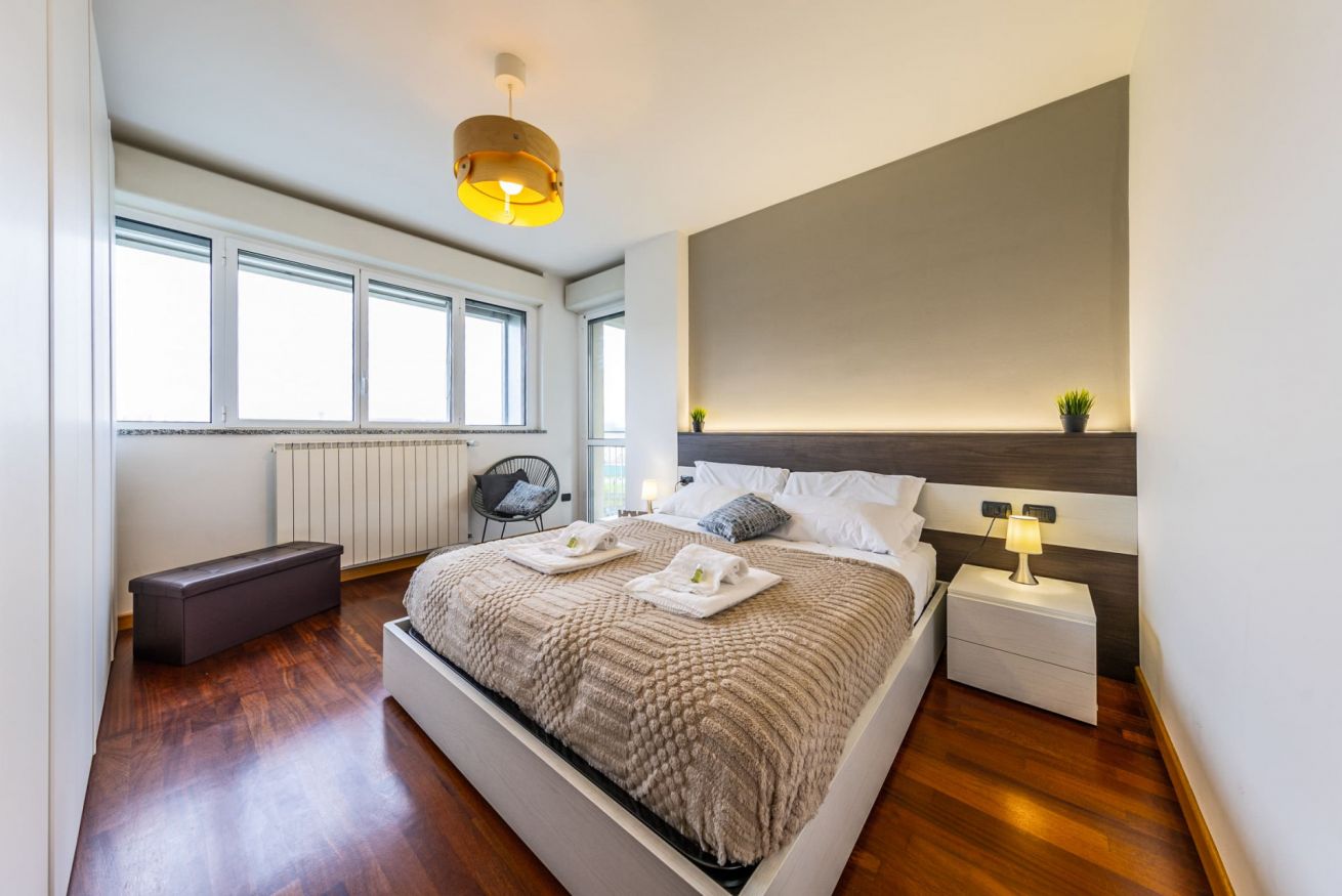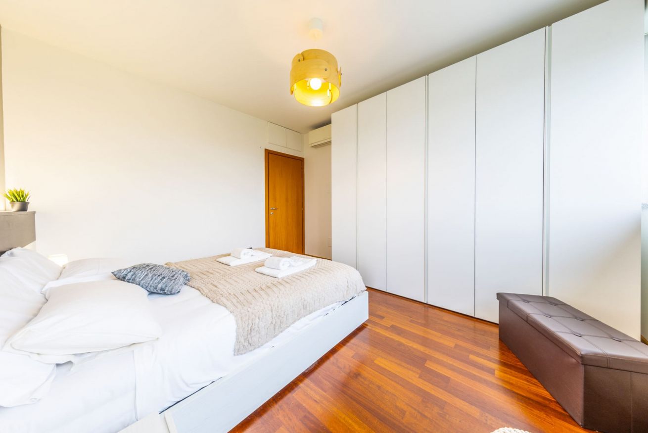 La camera da letto, confortevole e luminosa, dispone di un comodo letto matrimoniale Queen-Size, guanciali in memory foam, un grande armadio e una comoda poltrona. Dalla porta finestra si accede invece al secondo grande terrazzo con doppia esposizione e con affaccio rilassante sul parco.
