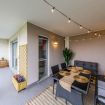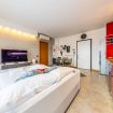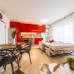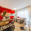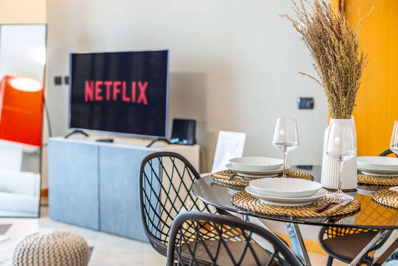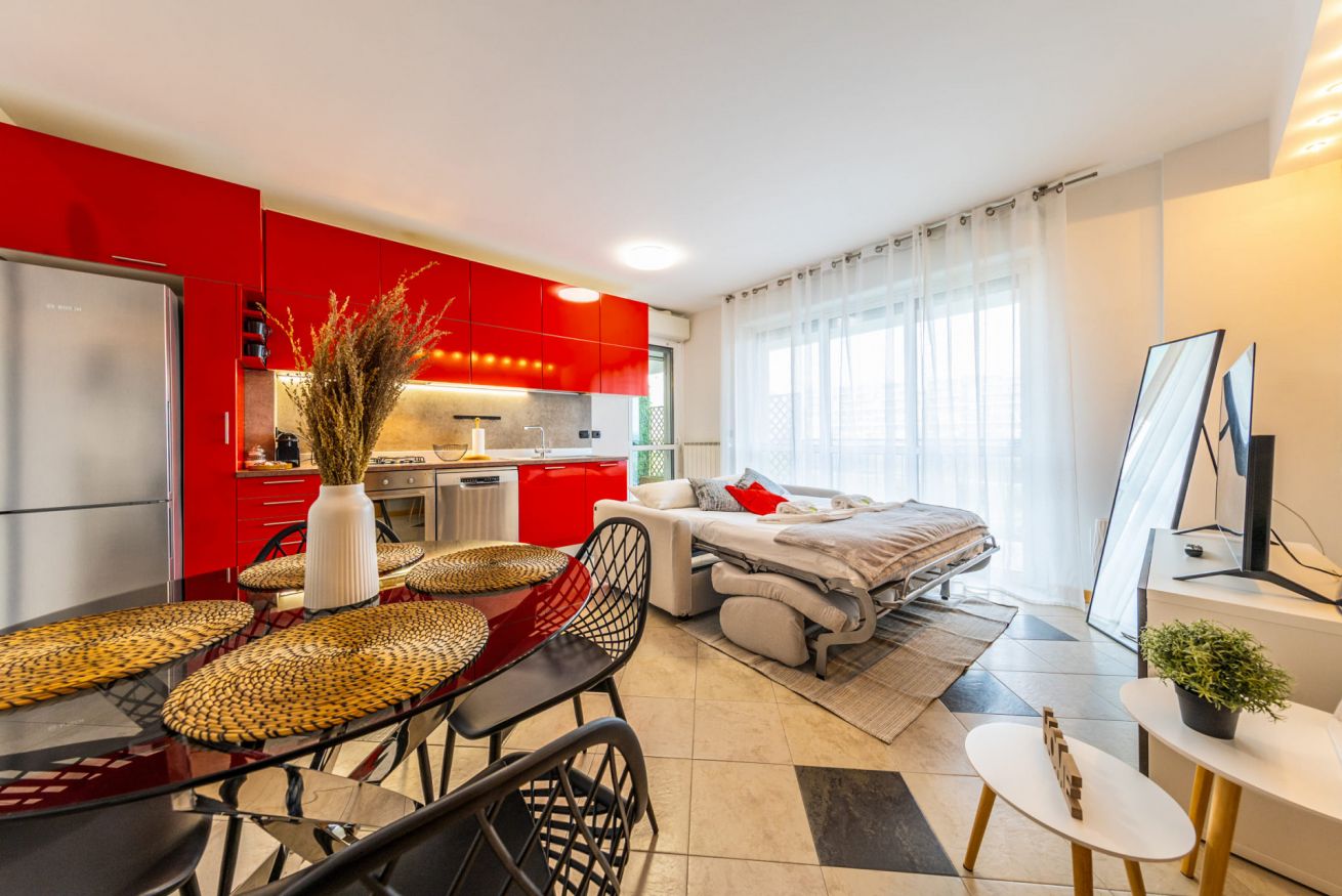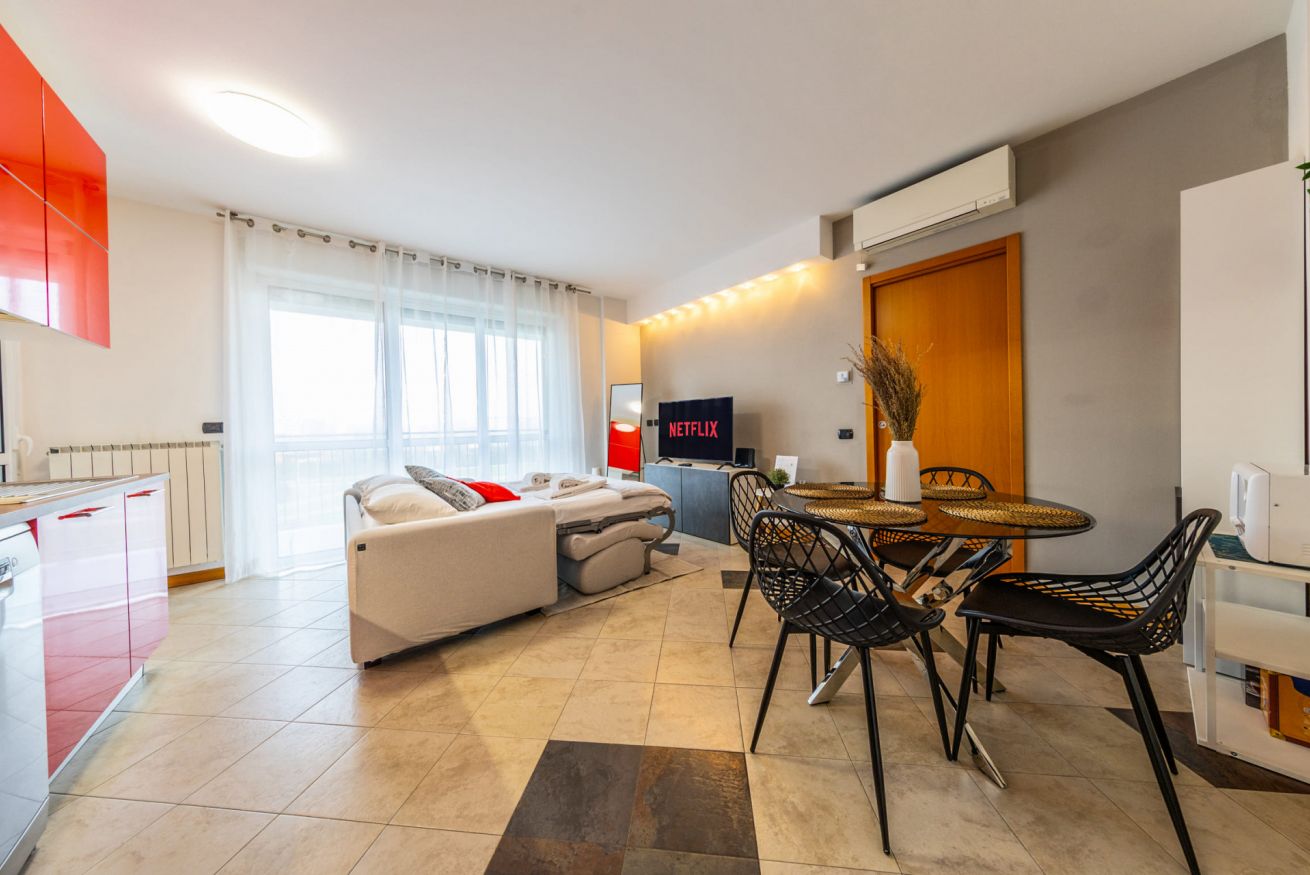 All’ingresso troviamo un'accogliente e luminosa zona living con comodo divano letto, cucina di carattere a vista completamente attrezzata, elegante tavolo da pranzo per quattro persone, specchio a figura intera (utilizzabile anche come appendiabiti sul retro) e smart TV con accesso a Netflix, YouTube, ecc.