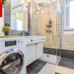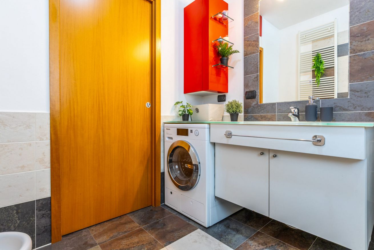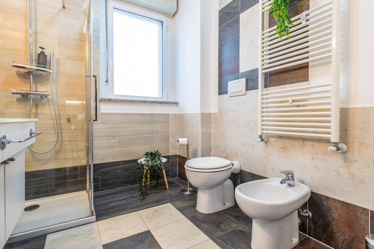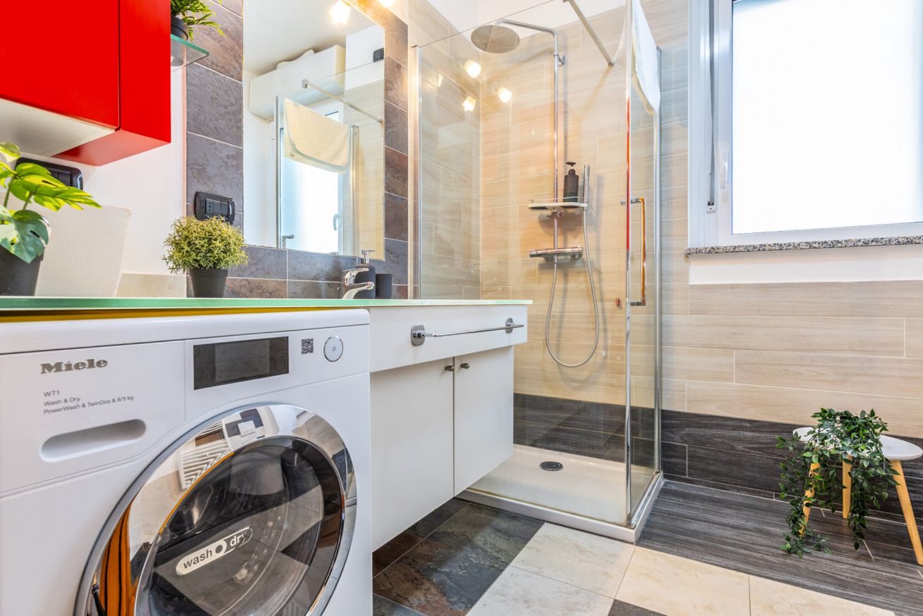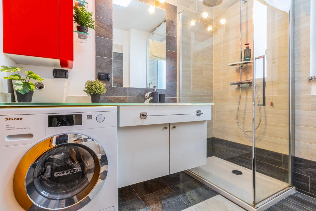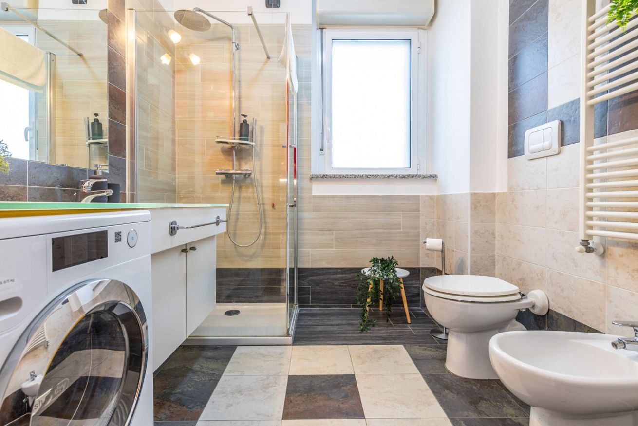 Il bagno è funzionale e dotato di cabina doccia, lavabo, wc, bidet, asciugacapelli, lavatrice e welcome-kit.